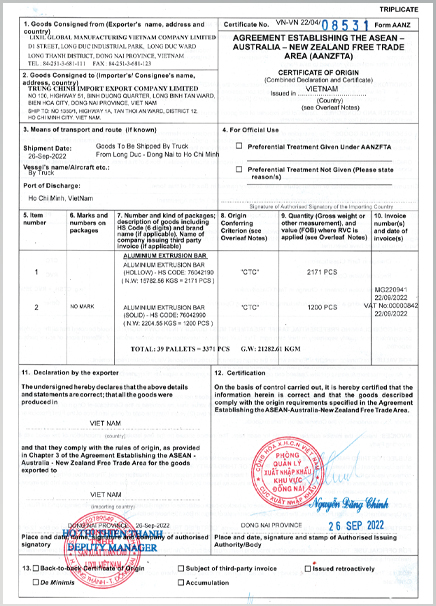 Được xác minh và đảm bảo về xuất xứ theo Hiệp định The Agreement Establishing the ASEAN – Australia – New Zealand Free Trade Area