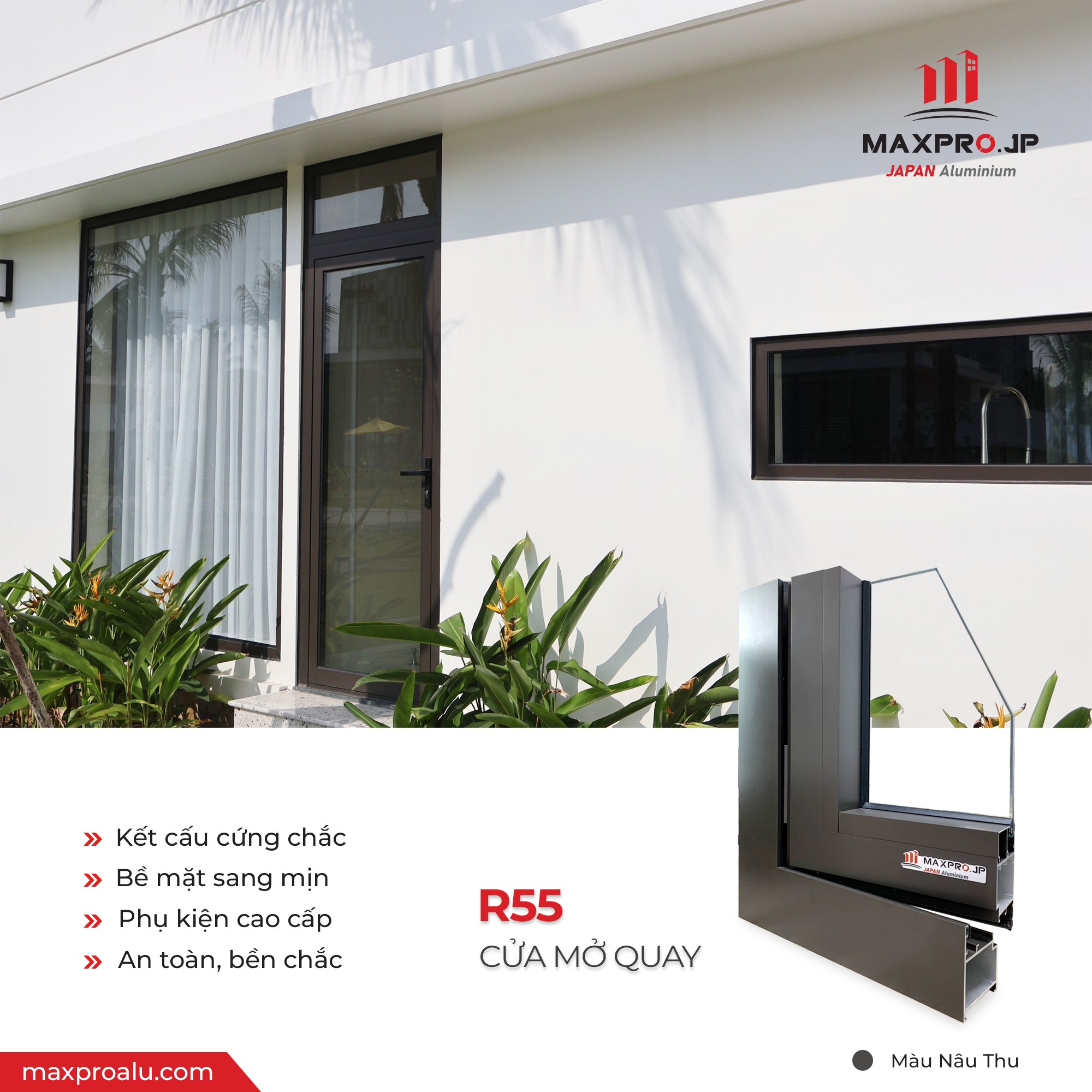 Hệ nhôm R55 là dòng profile có thiết kế phổ dụng, kỹ thuật sản xuất tiên tiến tối ưu cho quá trình sản xuất và thi công. Hệ profile R55 thương hiệu MAXPRO.JP mang đến độ bền cho công trình với tính thẩm mỹ cao cùng công năng tiết kiệm năng lượng, cách nhiệt, cách âm. Thiết kế phẳng hiện đại, phù hợp cho các bộ cửa từ nhỏ đến trung bình, như hệ thống cửa phòng và cửa sổ