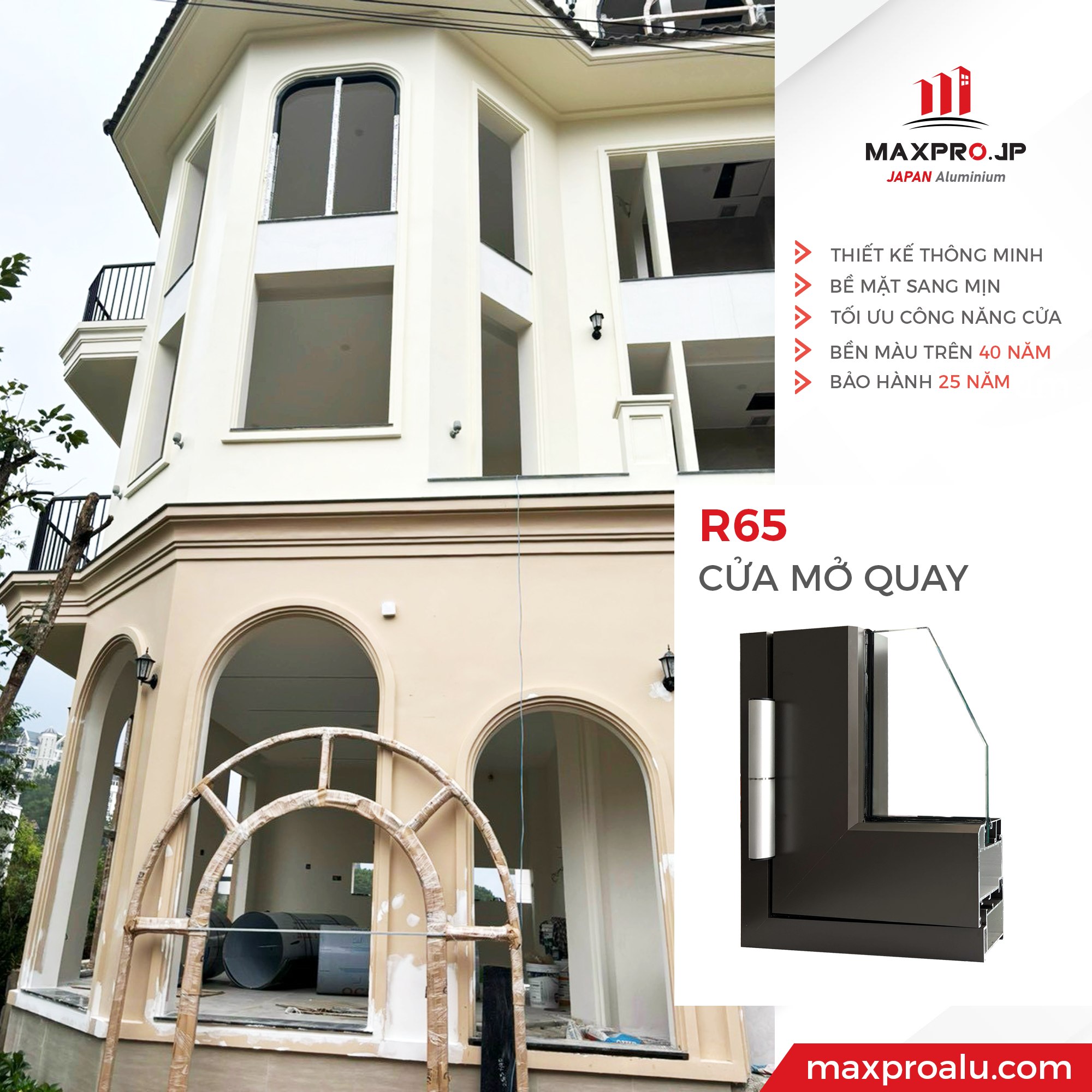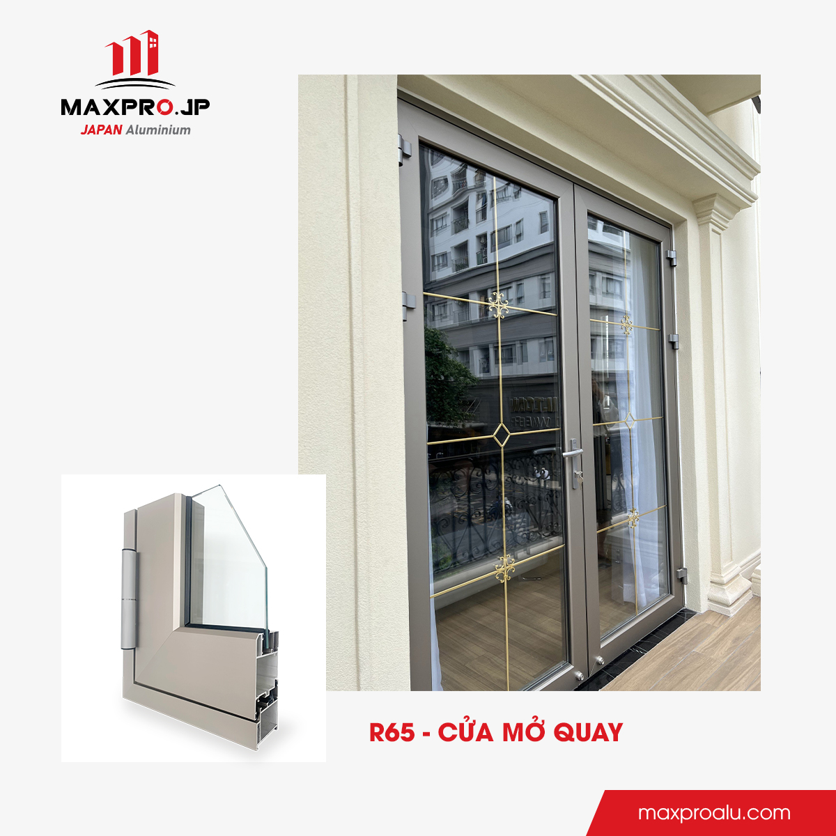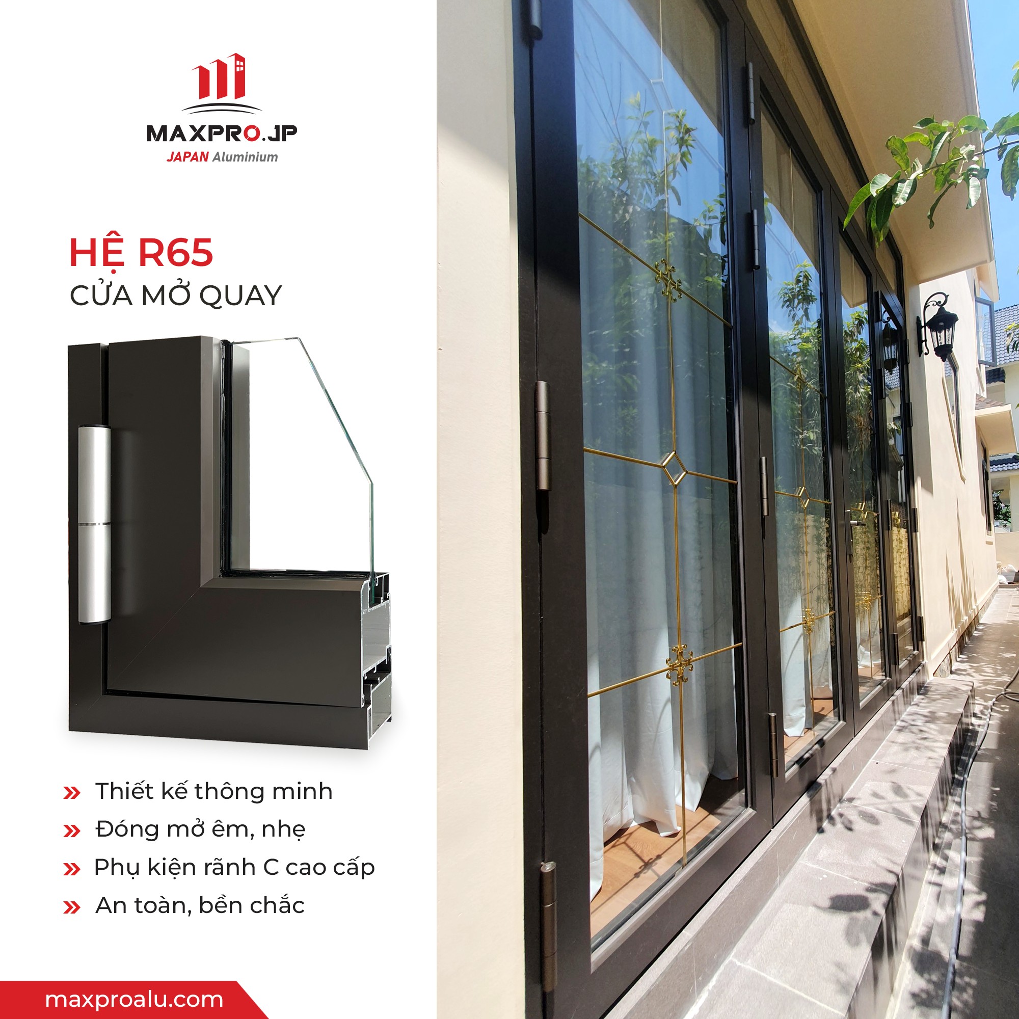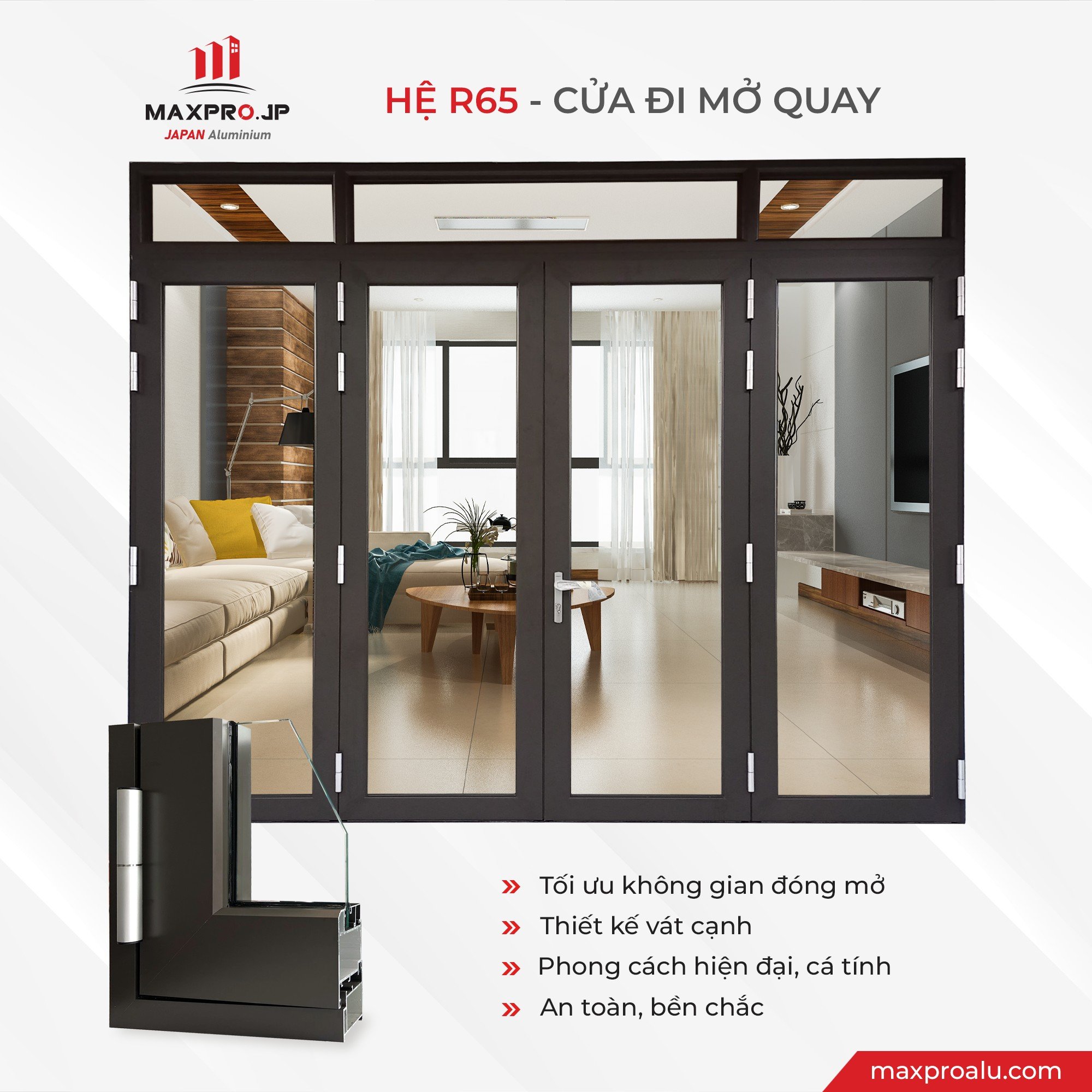 Cửa sổ và cửa đi mở quay với hệ nhôm R65 là dòng sản phẩm cao cấp của thương hiệu MAXPRO.JP, với thiết kế độc quyền, tối đa không gian mở và tăng cường khả năng lấy sáng. Hệ profile R65 có độ dày 2.5 mm tối ưu tính an toàn, đảm bảo độ cứng chắc và sự bền bỉ cho công trình. Thiết kế vát cạnh cá tính giúp tăng tính thẩm mỹ cho các hệ thống cửa, phù hợp cho cấu trúc cửa lớn, cửa chính mở rộng tầm nhìn, nâng cao giá trị không gian sống.
